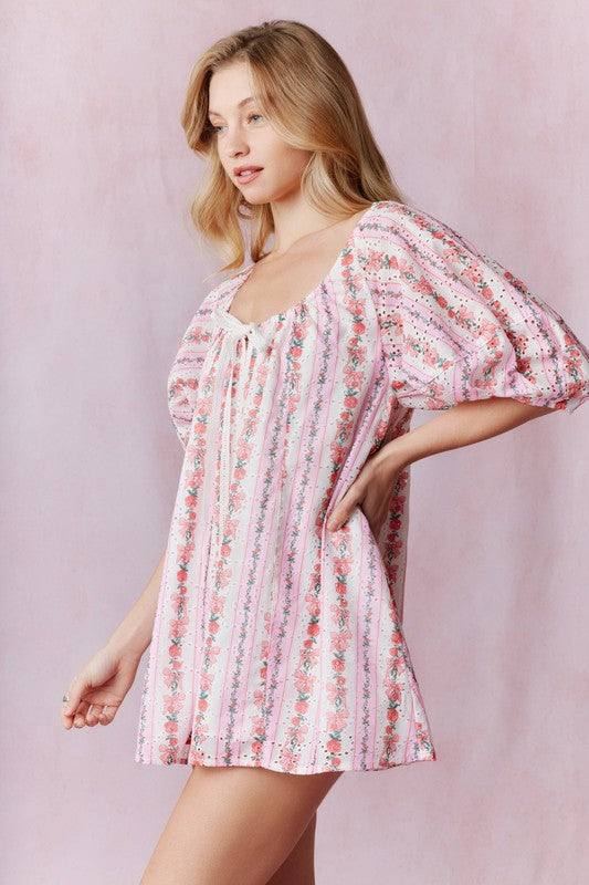 Floral and Denim Bubble Sleeve Dress